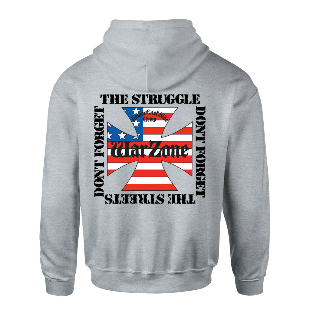 One-color front, four-color back, Warzone "Don't Forget The Struggle Don't Forget The Streets" hooded sweatshirt on grey, Independent Trading Co. IND4000 sweatshirts.